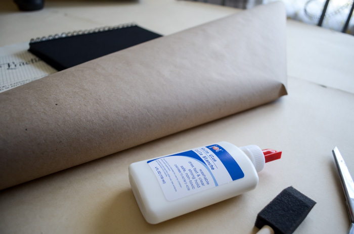 Before I went to the thrift store to pick out my supplies, I first came up with my color palette. I chose black, white, brown, and metallic for my theme and set off looking through the store.I started thinking about a tablecloth, and I knew I wanted to do something non-traditional. I headed over to the stationary and office supply aisle (one of my favorite sections of the store) and found black paper, brown mailing paper, a roll of wallpaper, and a really cool black and white calligraphy practice pad.