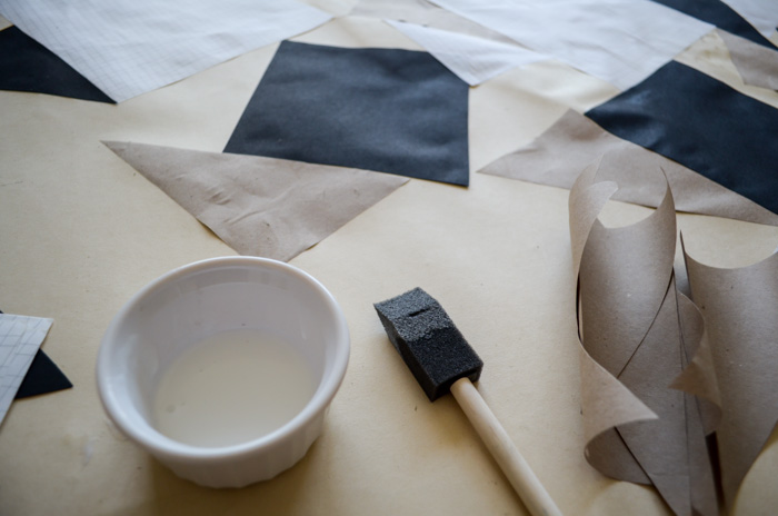 To make the table cloth, I used the back of the wallpaper as a base on the table, and then taped it on the bottom where the seam is. I cut up the paper into squares and triangles (small, medium, and large pieces) and used plain glue to adhere them to the wallpaper. I did some of the pieces side by side, and some of them overlapping. This takes a little while to glue them all down, but if you have a helper or two (this is a great project for kids!) it will go very fast. I wanted the pattern of the table to be unique and different from something that you could just buy at the store and I really like how it turned out!