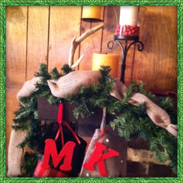 On the mantle candle holders were given a touch of Christmas being surrounded with evergreen garland and burlap ribbon. A red bead garland was taken apart and the beads used in a candle holder for a pop of color. Wooden letters were painted red and tied to the stockings with ribbon to identify which family member the stocking belonged to.