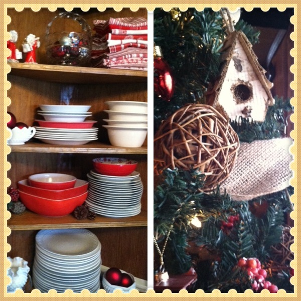 The hutch in the dining room was super fun to pull together. My dinnerware is an assortment of different patterns but all white. It’s so easy to change the look of the table with white as the anchor. I added a few vintage red pyrex serving pieces and bake ware. White hobnail candy dishes, 50’s era Christmas angels and some ornaments gave it a festive look. Using cotton kitchen towels as napkins, placemats or runners is another great way to save a few dollars.