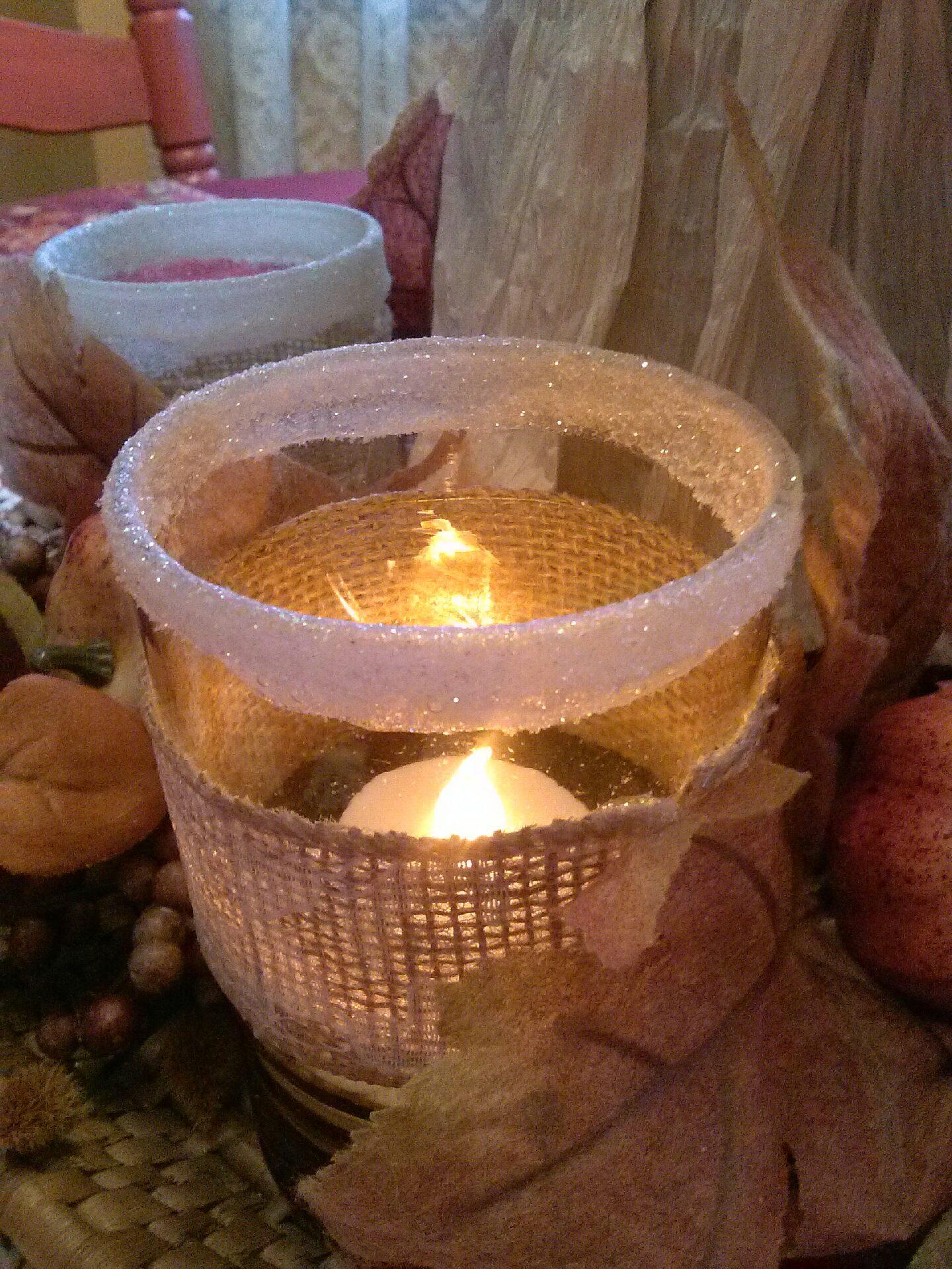 What you’ll need for the candleholders: double-faced tape, glue gun, diamond dust, Modpodge, assorted glasses (canning and jelly jars also work well), ribbon and battery-operated tea lights.