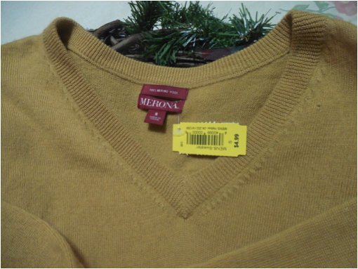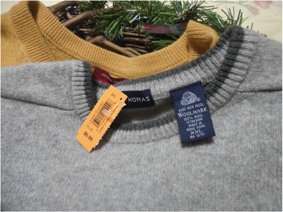 The next step is to find wool sweaters that are 90% to 100% pure wool. Since this is the Christmas season, I hit up all the red sections over and over again until I found the perfect sweater. I then grazed through the rest of the knits and found a lovely soft gray sweater made of merino wool and another in gold. Each of these cost $8.00, $7.00 and $5.00 respectively.