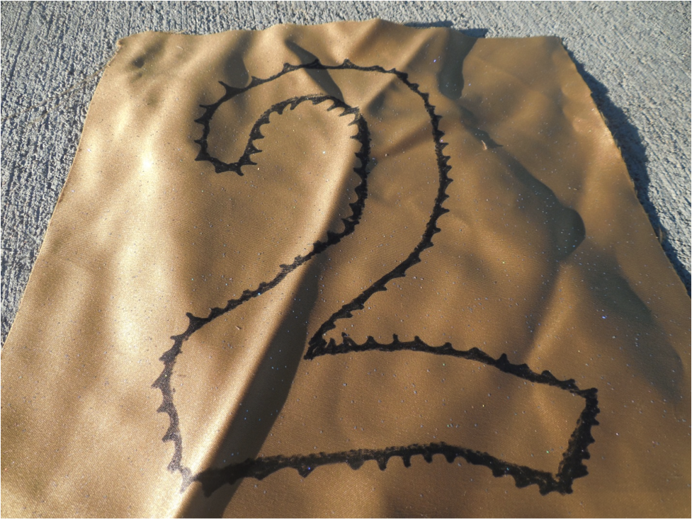 The first step is to cut out a long strip of fabric to use to hang all the other banner components on. Next cut out four large squares. I eyed mine and they turned out to be about 8 inches by 8 inches. I cut number stencils out of cardboard and used them to apply the glue and glitter. I made slits in the upper corners of the fabric panels so I could string them onto the original strip of fabric.