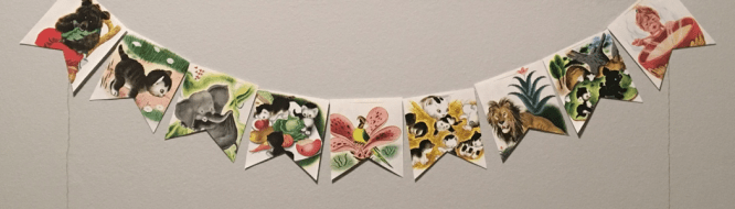 I’ve seen some beautiful garlands, lately, and handmade bunting that I’ve wanted to try to create. There are many different styles using paper, cloth, yarn, etc. so I’m starting with paper but will try the other mediums in the future. I was browsing the (huge) book section at my local ARC Thrift and was inspired by the bright illustrations in some vintage Little Golden Books that I spotted.