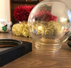 I spotted this interesting glass globe for only $3.49 and immediately thought of a snow globe. I’ve used jars from arc for globes in the past and wanted to try again with this cool piece. The base unscrews from the glass dome, allowing me to get fun, winter decorations inside.