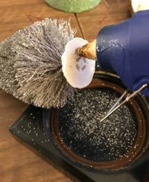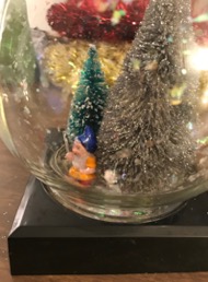 I started by hot-gluing two trees from my arc bag onto the base of the globe: a silver glitter tree and a green tree. Glitter is a mainstay all over my house during holiday craft season.